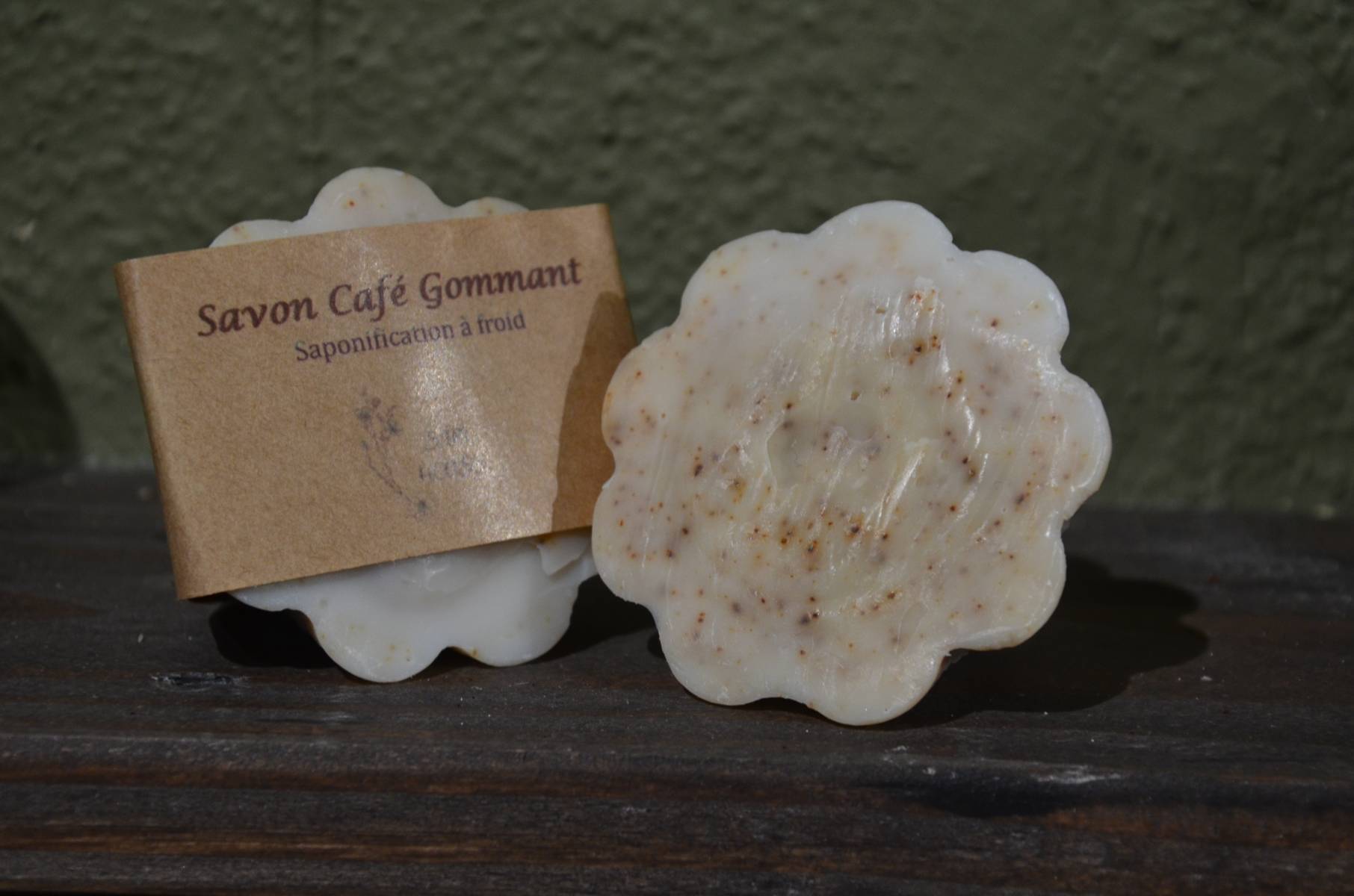Savon douceur gommant au café, huile végétale et lait de chèvre.